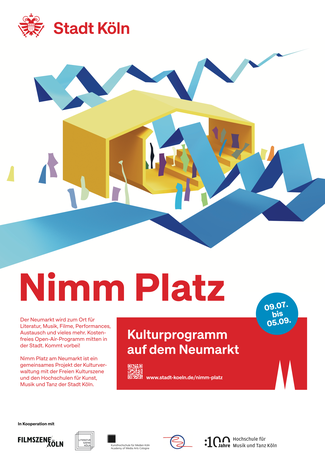 Nimm Platz am Neumarkt ist ein gemeinsames Projekt der Kölner Kulturverwaltung und der Freien Kulturszene, mit Beiträgen der Hochschule für Musik und Tanz sowie der Kunsthochschule für Medien.